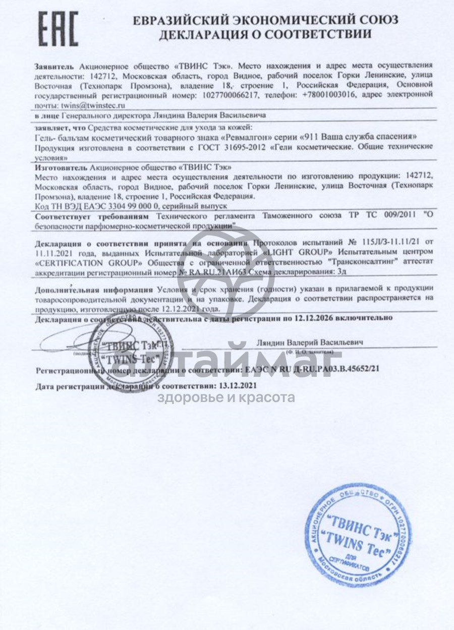 - Чтобы купить Гель для тела РЕВМАЛГОН 911 совершите всего несколько шагов: укажите количество продукта и нажмите на кнопку «Купить».