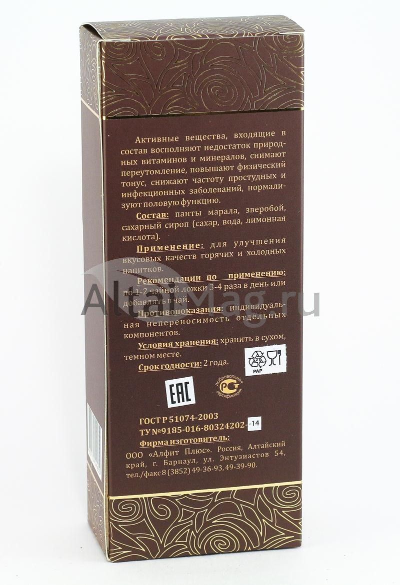зверобой, панты марала, сахарный сироп (вода, сахар, лимонная кислота).