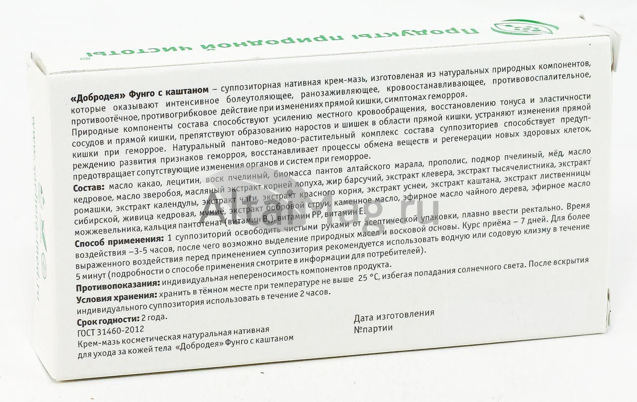 - Чтобы купить Добродея Фунго с каштаном средство для интимной гигиены (профилактика геморроя) №7 Сашера-Мед совершите всего несколько шагов: укажите количество продукта и нажмите на кнопку «Купить».
