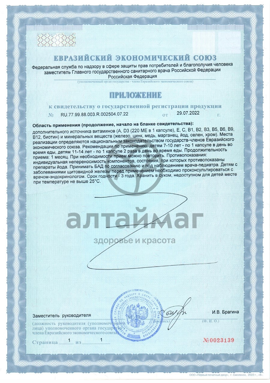 Комплекс витаминов и минералов, разработанный специально для поддержания детского здоровья, в период роста, интенсивных умственных и физических нагрузок.