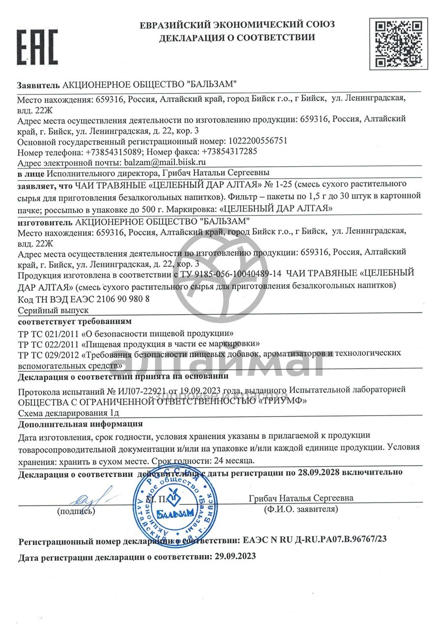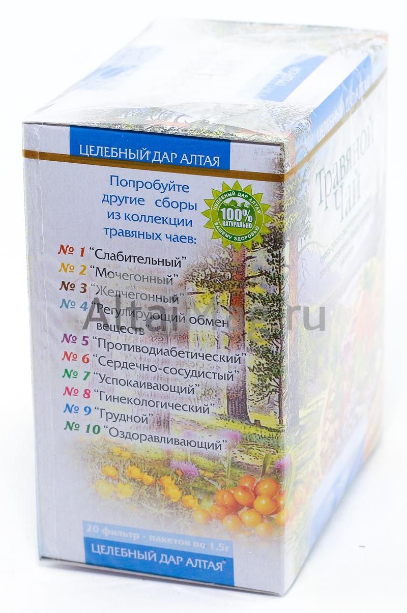 Натуральные травяные чаи Целебный дар Алтая изготовлены из ценнейших лекарственных растений, ягод и плодов, бережно собранных в экологически чистых районах Алтая. Попробуйте травяной чай, из коллекции Целебный дар Алтая, и он наполнит Вас силой могучих гор, бодростью горных рек, энергией и здоровьем сибирской тайги, создаст атмосферу приятных воспоминаний или мечтаний об удивительных путешествиях на Алтай. Сбор повышает сопротивляемость организма к вирусам и простуде. Оказывает противовоспалительное и спазмолитическое действие, облегчает дыхание, успокаивает кашель. Оказывает тонизирующий эффект. Укрепляет эндокринную и иммунную системы. Способствует оздоровлению и укреплению организма при простудных заболеваниях.