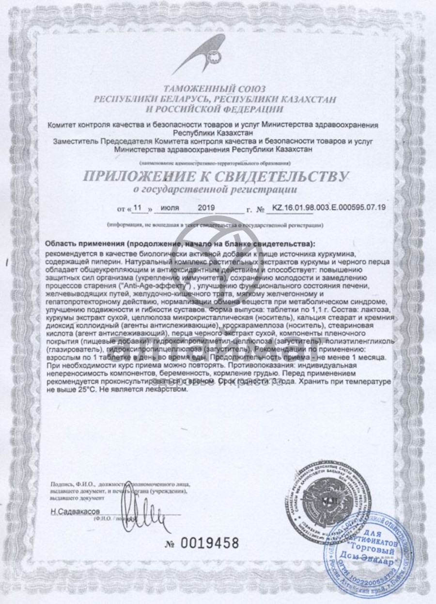 Куркумин и пиперин проявляют антиэйдж-свойства, в том числе благодаря способности бороться с оксидативным стрессом; обладают общеукрепляющим свойством; способствуют поддержанию нормального функционального состояния печени, желчевыводящих путей и желудочно-кишечного тракта; защите печени и желчегонному действию; поддержанию обмена веществ при метаболическом синдроме; сохранению подвижности и гибкости суставов.