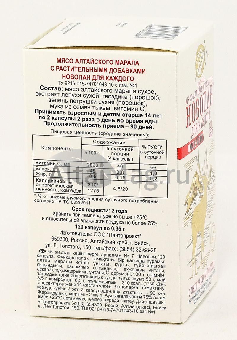 Новопан №7 для каждого после 45 лет — рекомендован для удовлетворения потребности организма человека старше 45 лет в ценных пищевых веществах, витаминах, микро- и макроэлементах.