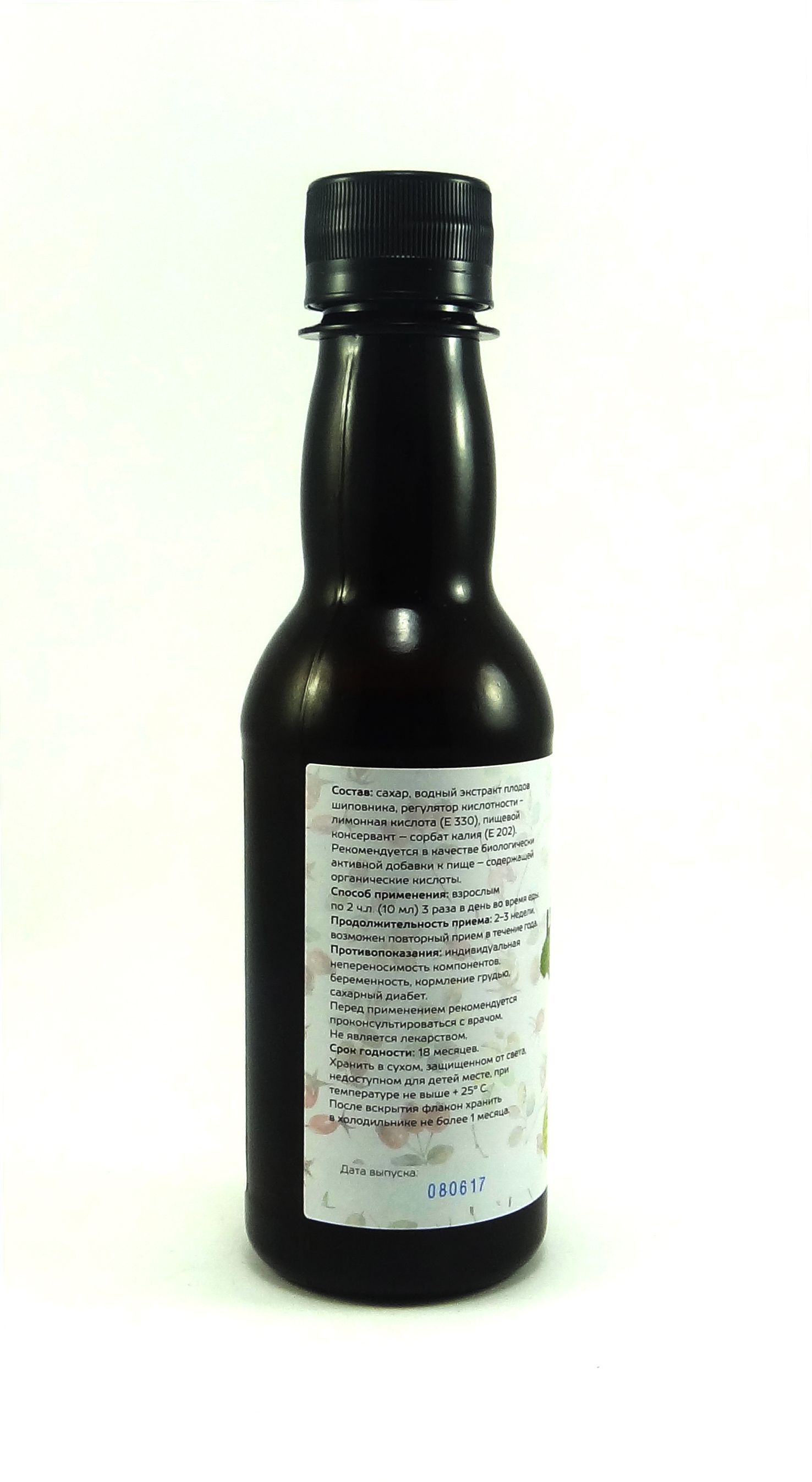 Водный экстракт плодов шиповника, сахар, пищевой консервант, регулятор кислотности. Продукт представляет собой однородную густую массу коричневого цвета с кисло-сладким вкусом. Объём – 250 мл.